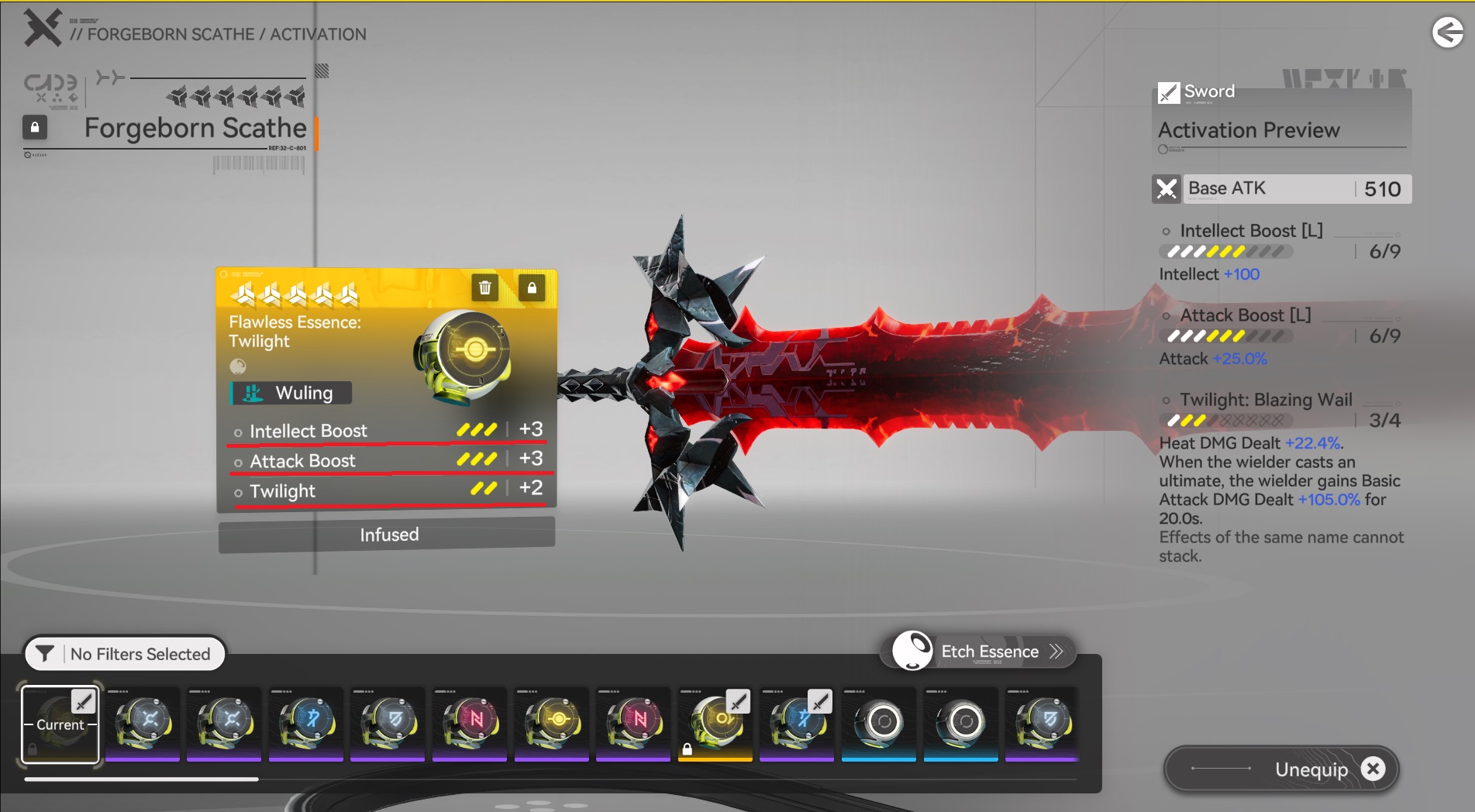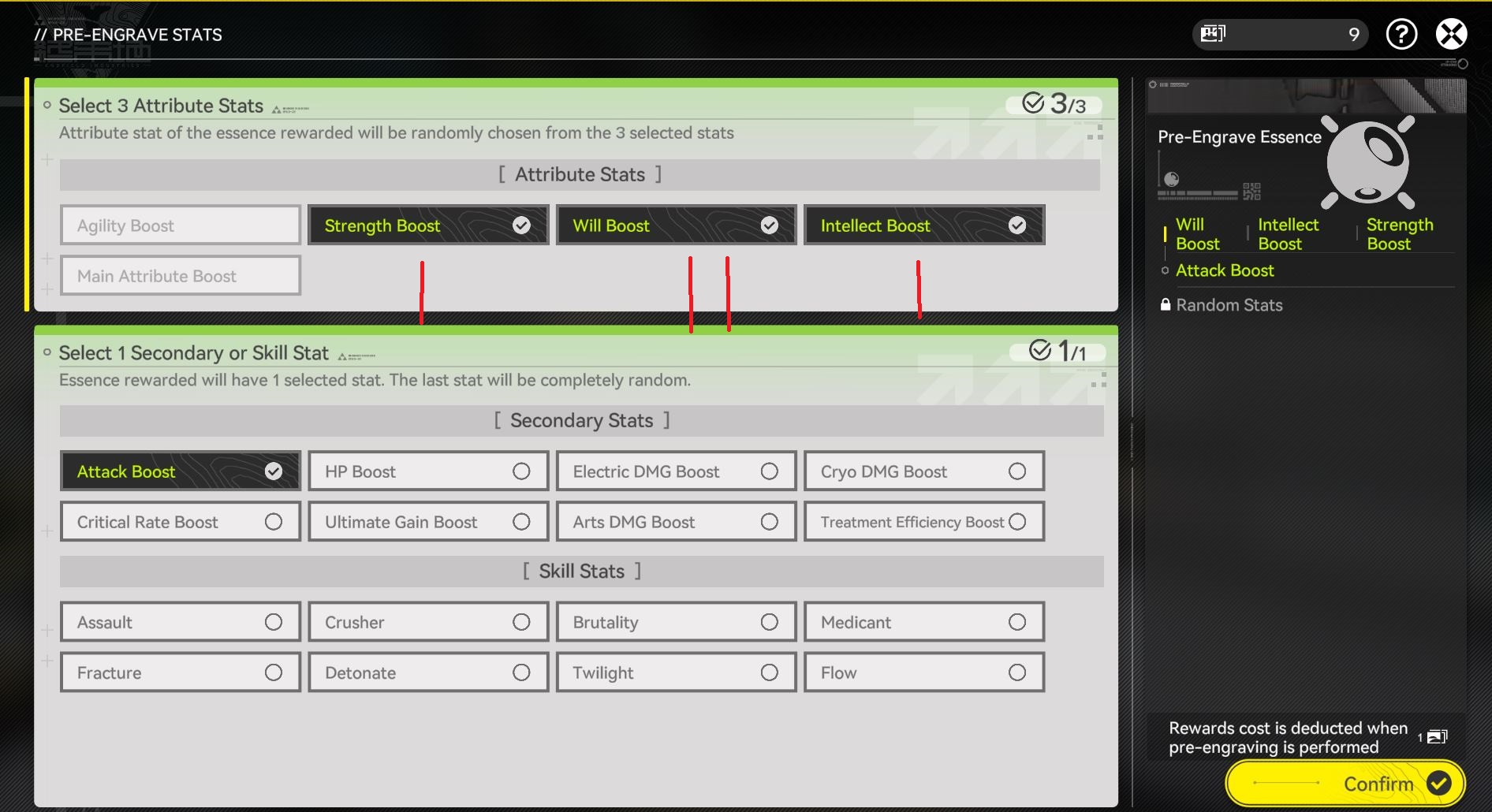 Here selecting Int + will + str & attack boost provides us with 4 options of drop 3/3 for each of the selected weapons, with Laevatain's limited weapon as our primary target