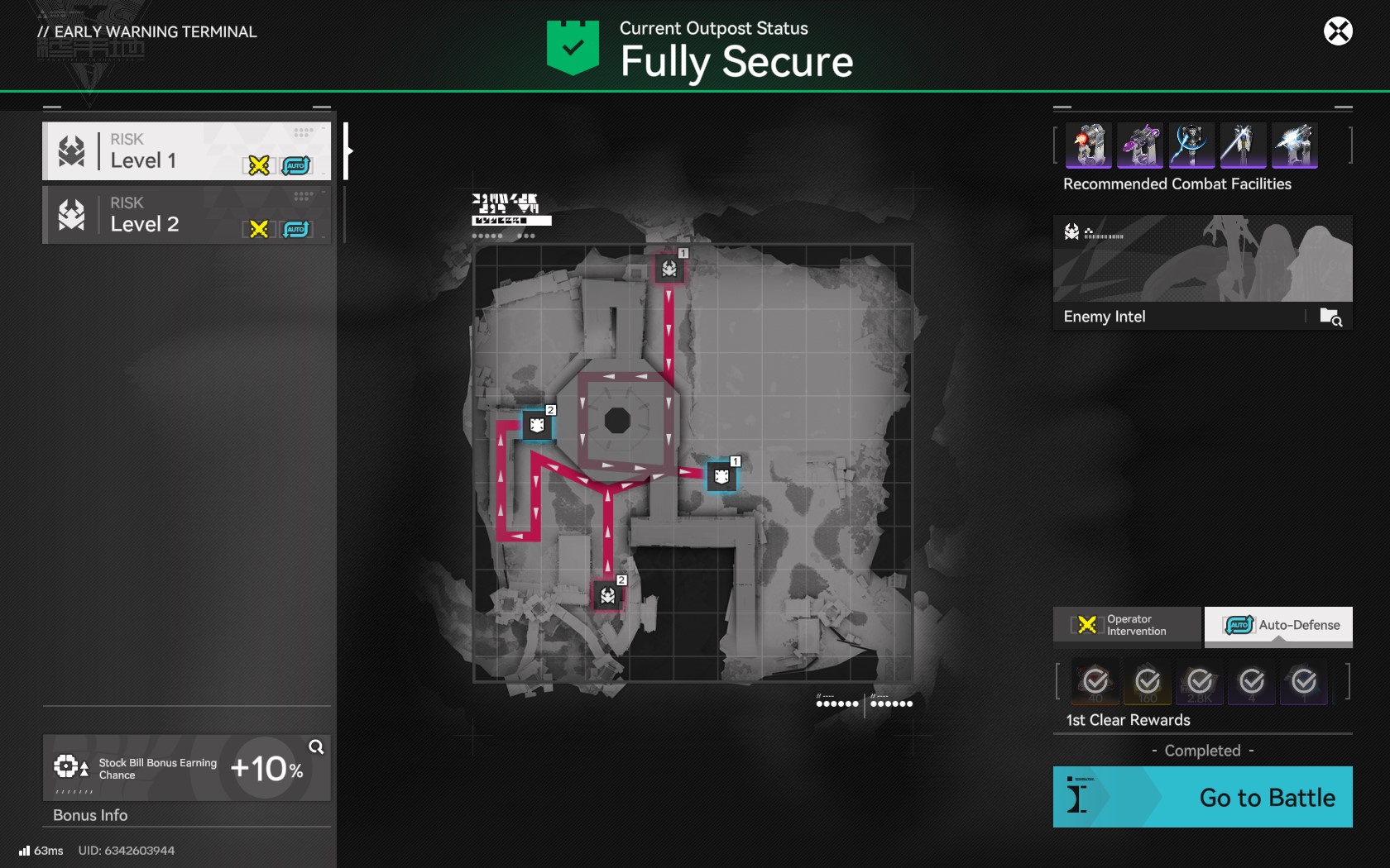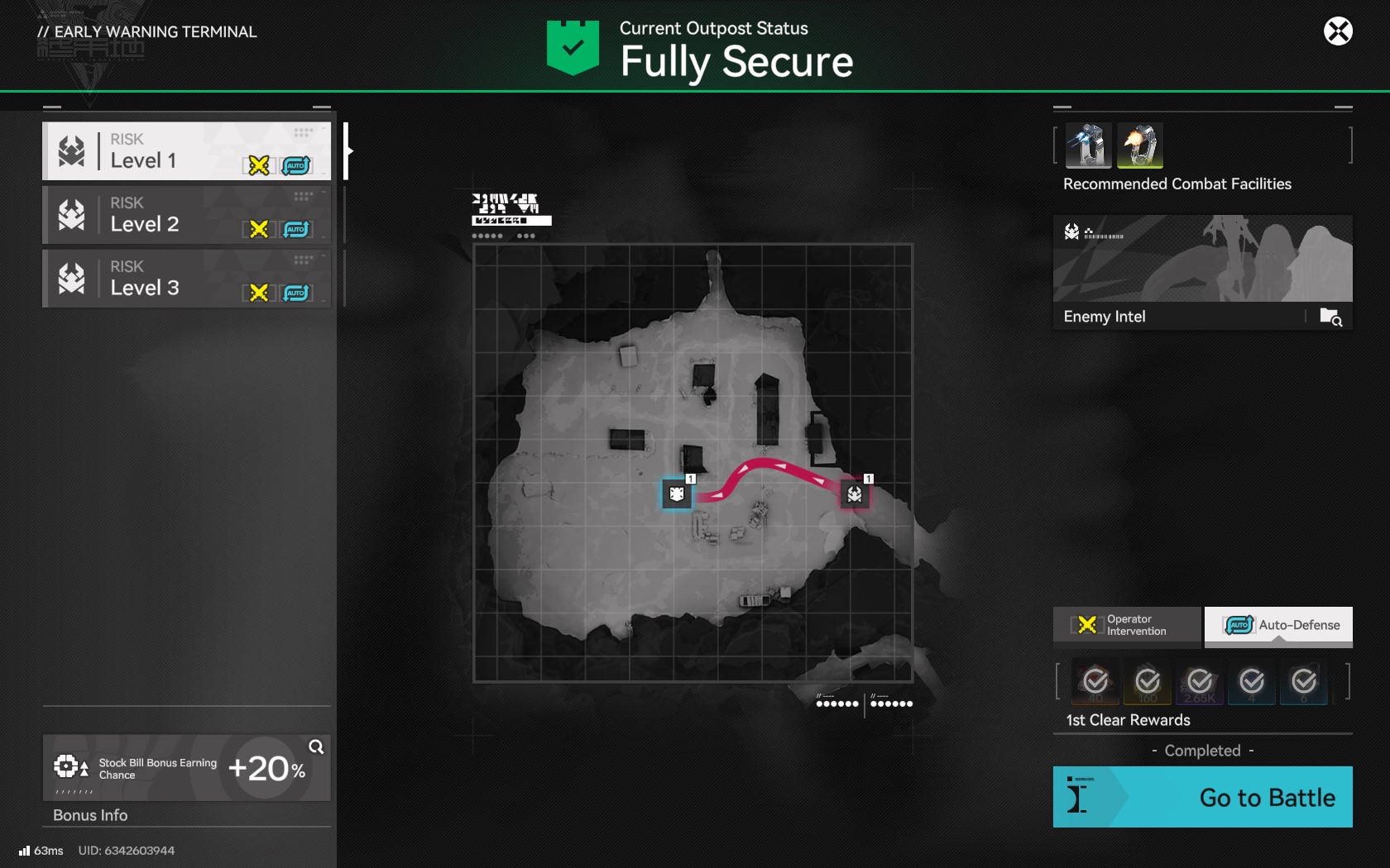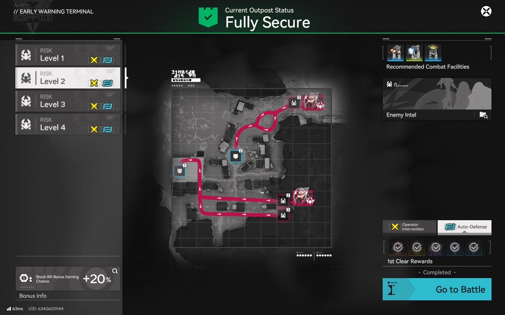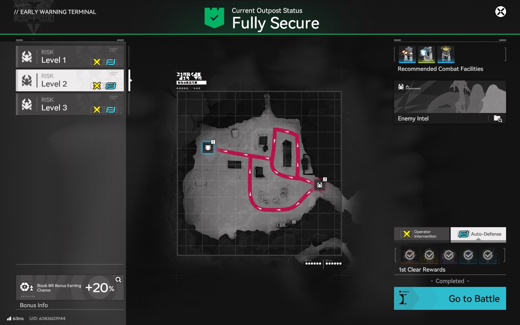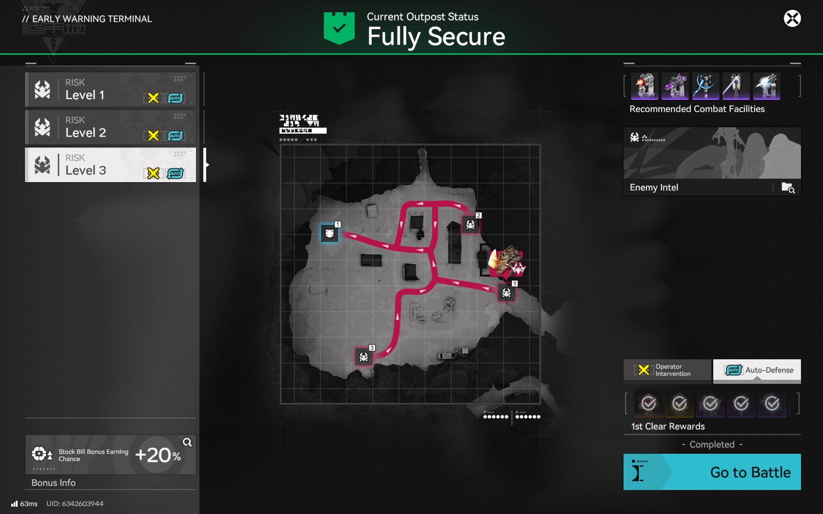 Interact with the terminal, and a detailed panel opens up, showing each Risk Level on the left. With Enemy Intel, First Clear Rewards, and recommended towers to beat the stage on the right of screen. And the actual lanes enemies will take on the map in the middle, with the targets you need to protect.