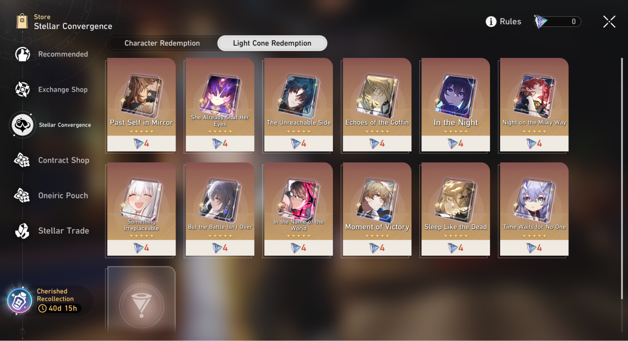 Stellar Convergence Shop will also allow players to exchange 4 Light Cone Memory Shards for a corresponding Signature Light Cone of the available characters for exchange and those available for the new Pity System.