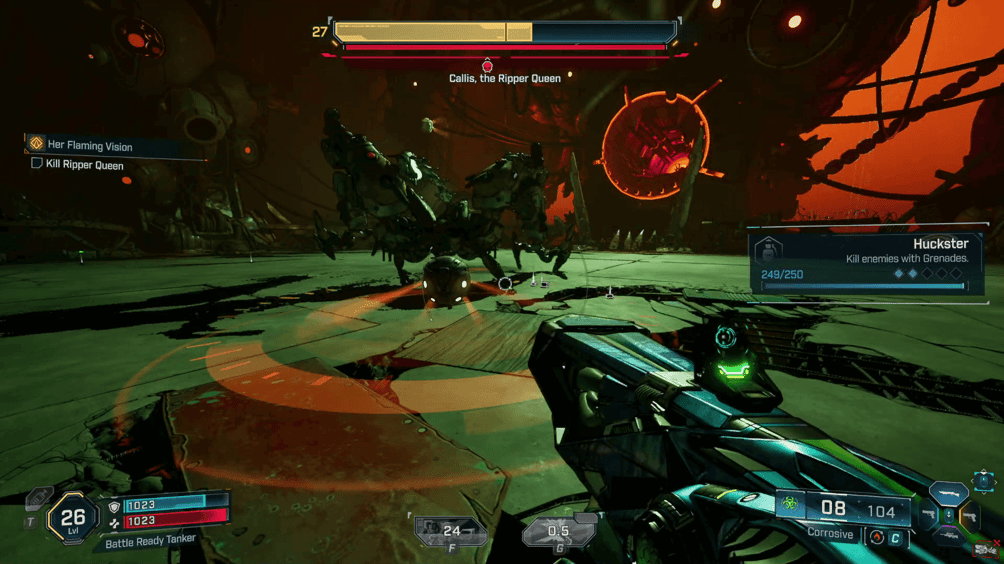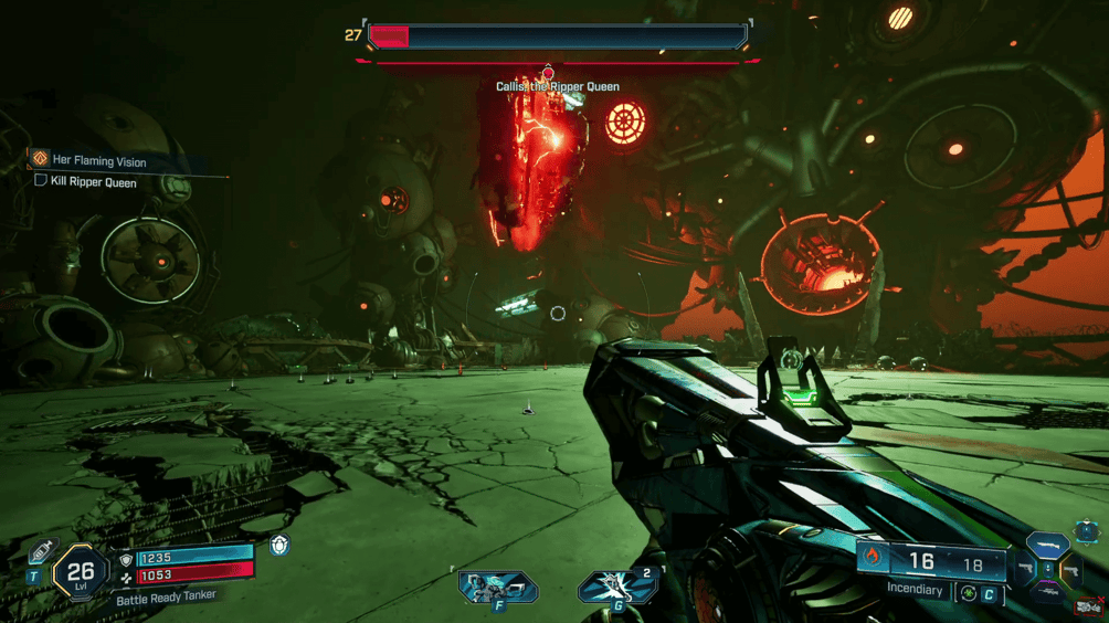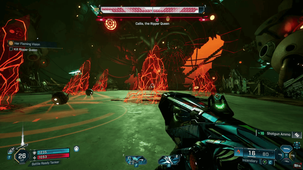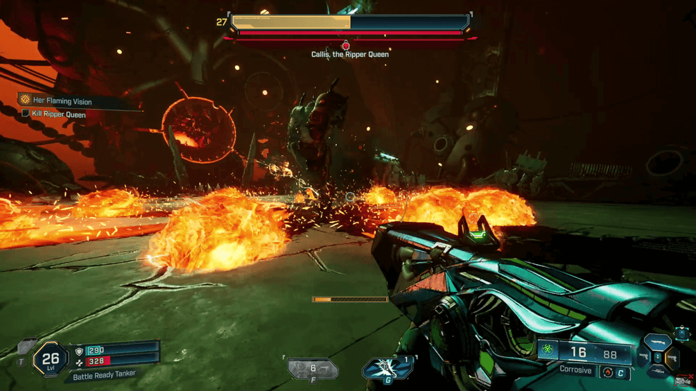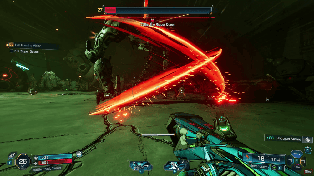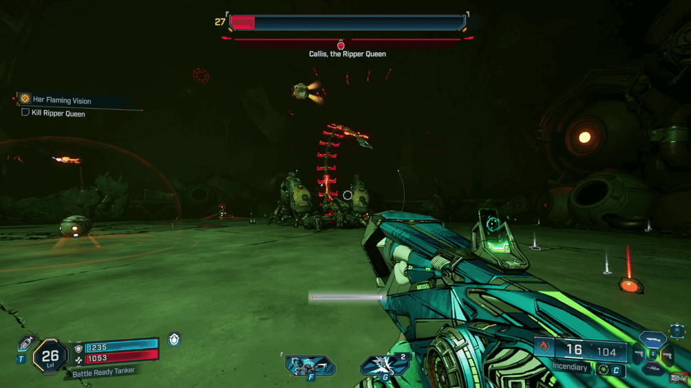 Callis has two healthbars: Armor, and thenFlesh. As Armor she will take extra damage from 🟢Corrosive and ☢️Radiation, and as Flesh she takes increased damage from 🔥Incendiary (up to 175% on Hard/UVH5 difficulty)