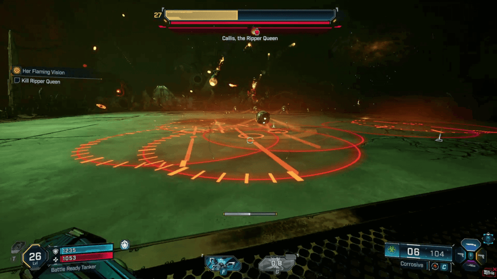 What Happens: Callis immobilises herself to fire out several rounds of rockets towards the player. These rockets deal damage and knockback in a circle on the ground.