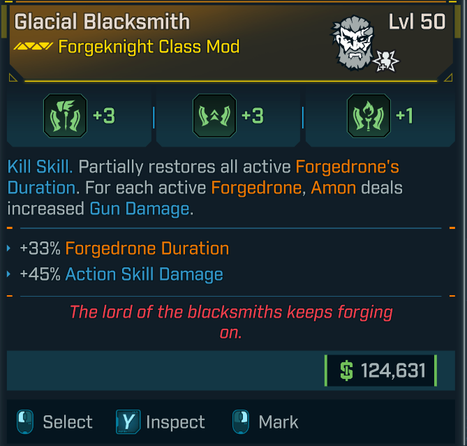 Blacksmith Class mod. This class mod gives Amon a kill skill to support a forgedrone playstyle.