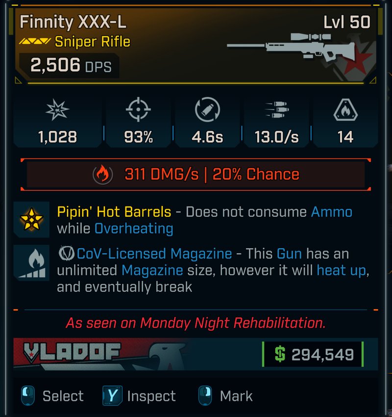 Finnity XXX-L Has a vey high fire rate for a sniper feeling more like a mini-gun & Doesn't consume ammo while overheating.