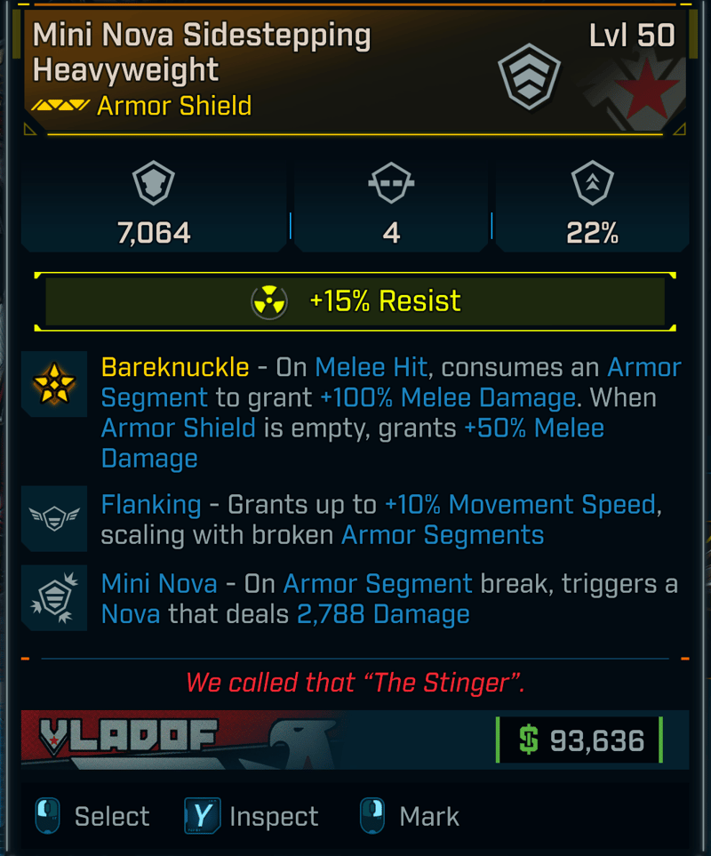 Heavyweight Melee depletes an Armour Segment for +100% Melee Dmg. +50% while empty.