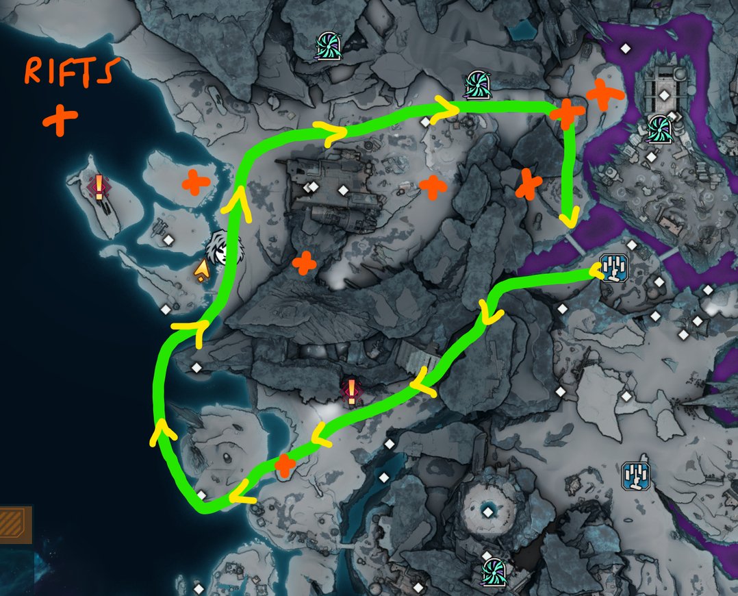 Upon arriving, follow this handy, and very professionally drawn map guide on your vehicle. Since the rifts spawn on a radius detection based system, we'll be using it to our advantage and looping as many of these zones as we can on the way.