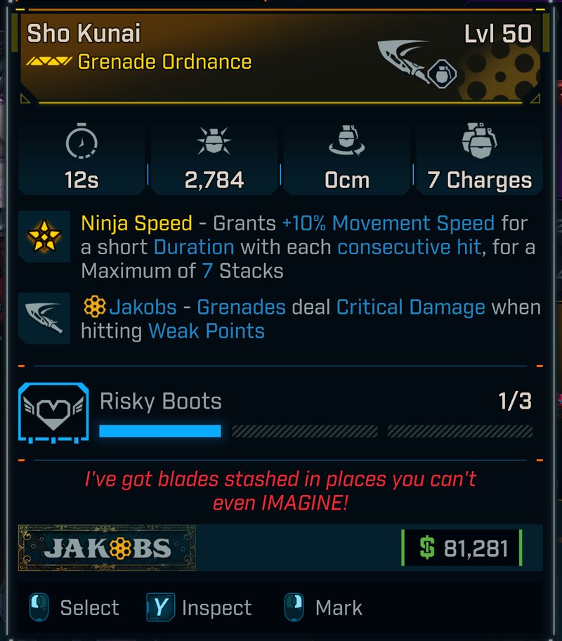 Sho Kunai +10% movement speed with each hit, max 7 stacks. for a total +70% movement speed