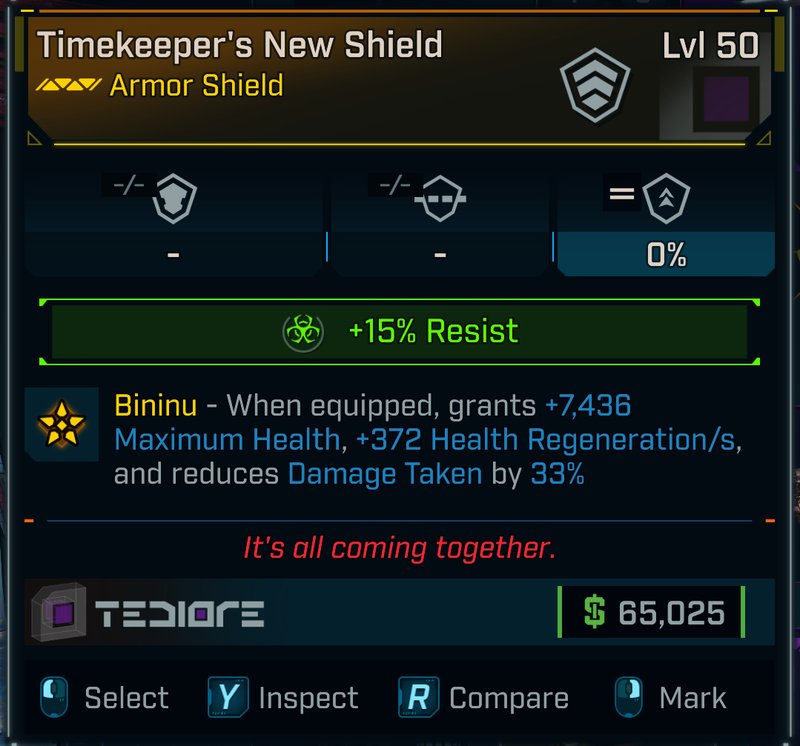 Timekeeper's New Shield Removes all shields, Increases HP by [amount]. Grants [amount]/s HP regen. +33% dmg resist.