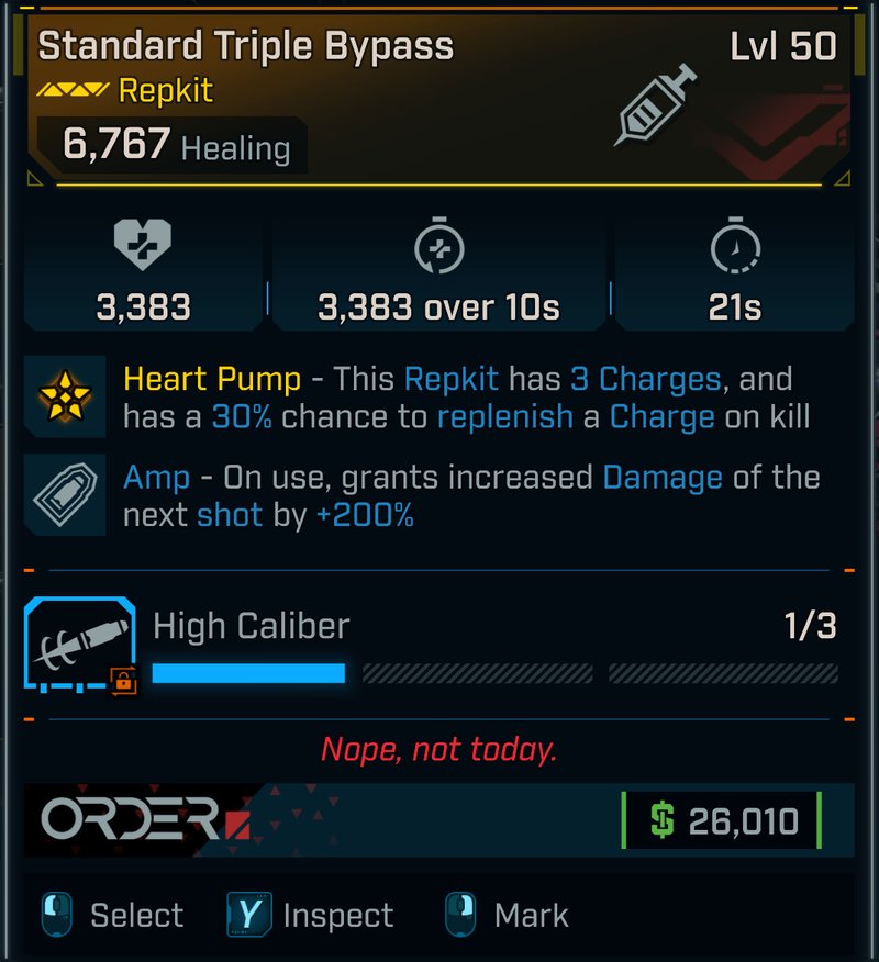 Triple Bypass Has 3 charges. With a 30% chance to replenish a charge on kill.