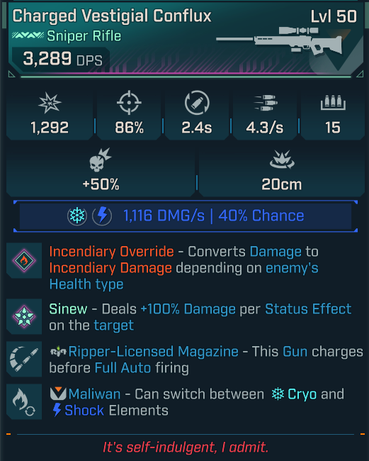 Mercredi cycles between different firing modes on reload. While you lock on to a target, you get a stacking buff which grants +50% damage per stack.