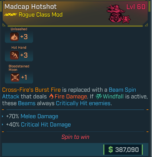 Cross-Fire's Burst Fire is replaced with a Beam Spin Attack that deals Fire Damage. If Windfall is active, these Beams always Critically Hit enemies.