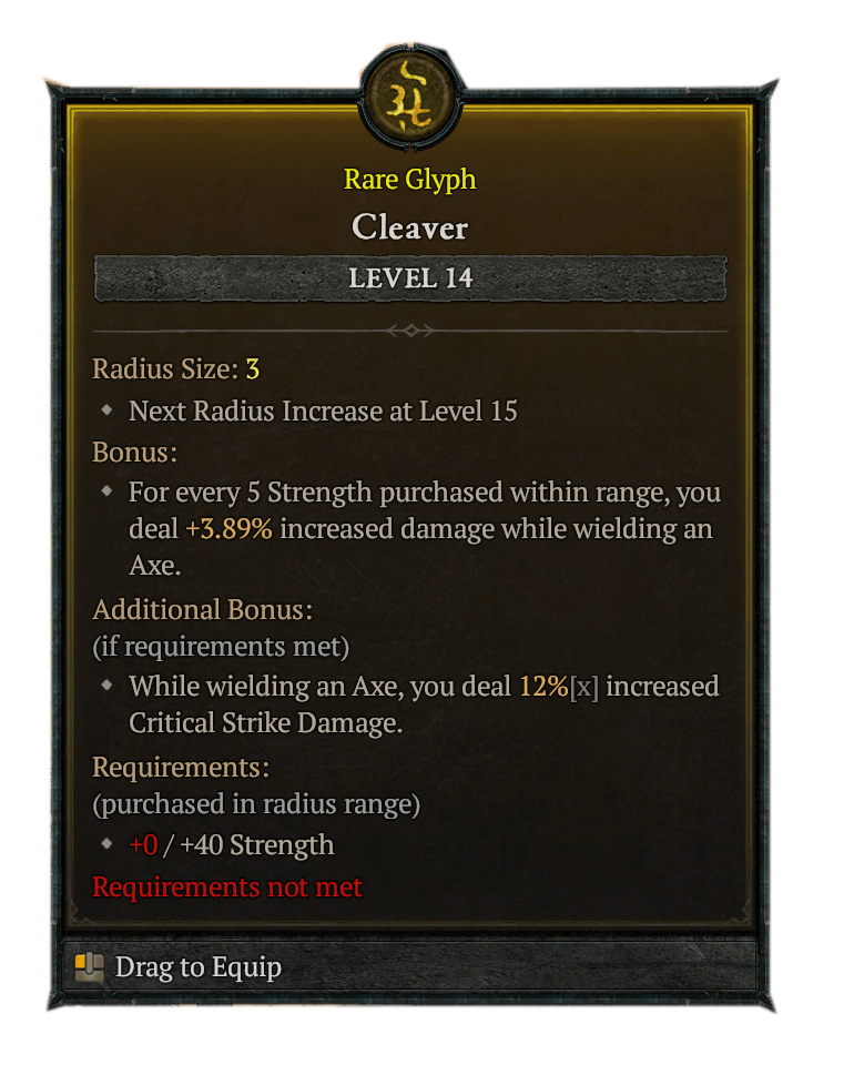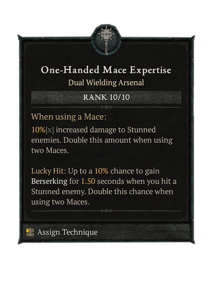 One cool thing you can do with dual wielding is use passives and glyphs for multiple weapon types. For example, if you had a one-handed mace and a one-handed axe, you could use Concussion on the skill tree (which requires a mace) and Cleaver on the paragon board (which is an axe-specific glyph).