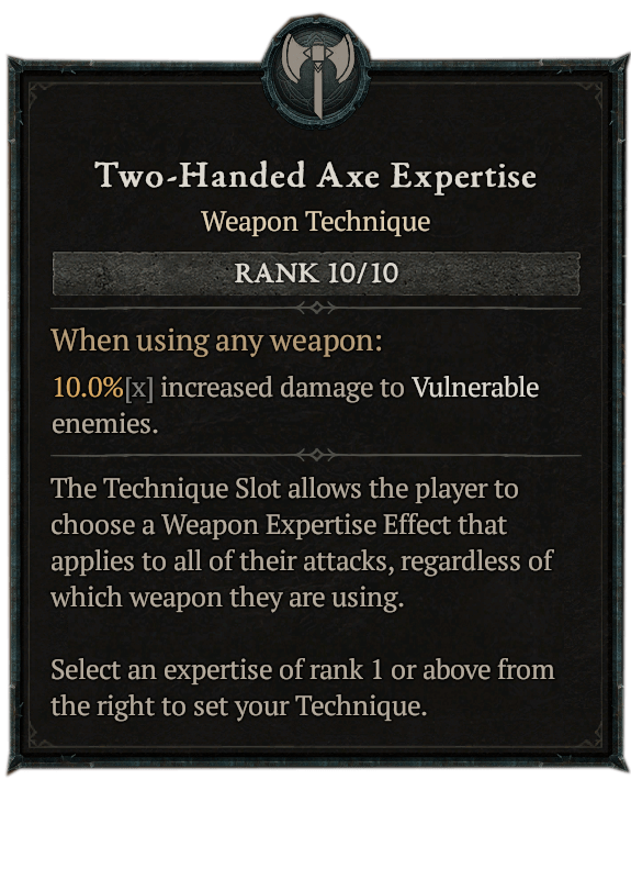 An example of this would be if you had a two-handed axe assigned to your main damaging skill and had a two-handed axe assigned as your weapon technique. You would receive 20% increased damage to vulnerable enemies and 10% increased crit chance to vulnerable enemies for that skill.