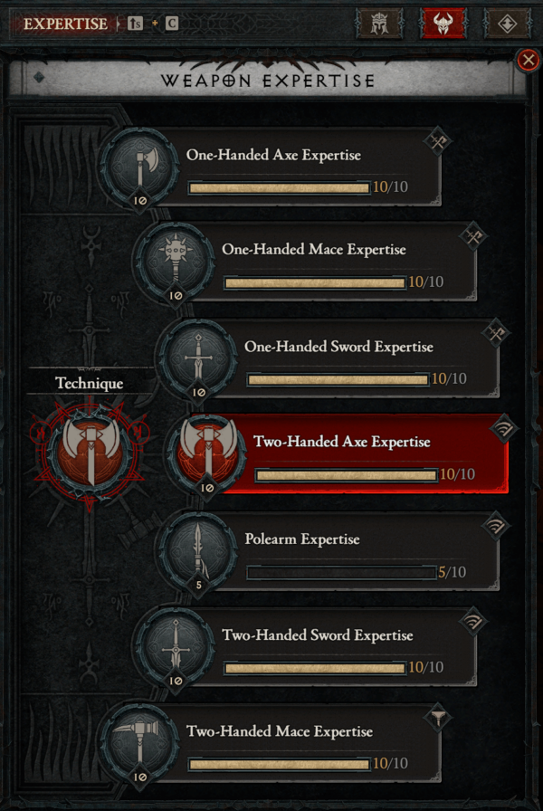 When you press Shift+C in-game, you will bring up your Barbarian passive UI. Along the right, you will see the expertise for every single weapon type, their current level, and associated bonuses.