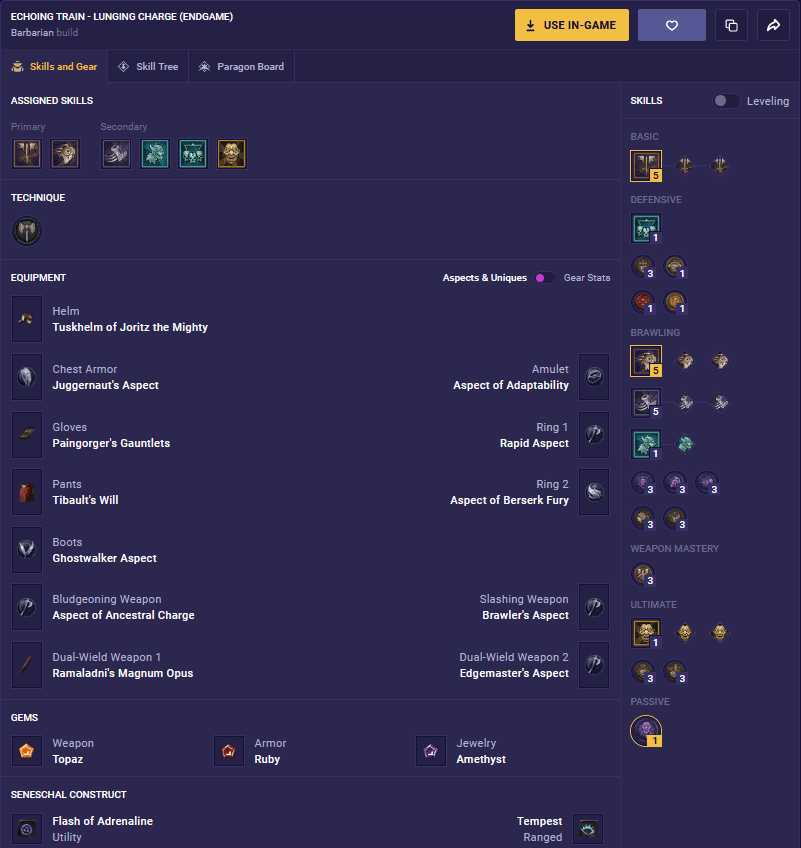 Beatdropper, our Barbarian Expert, is hyped about his “Echoing Train” build. He told me that it has double instances of damage (Charge + Wall Ramming), Berserks easily, is unstoppable while Charging, and has a beefed-up basic skill that gets echoed to all tagged mobs and then detonates.