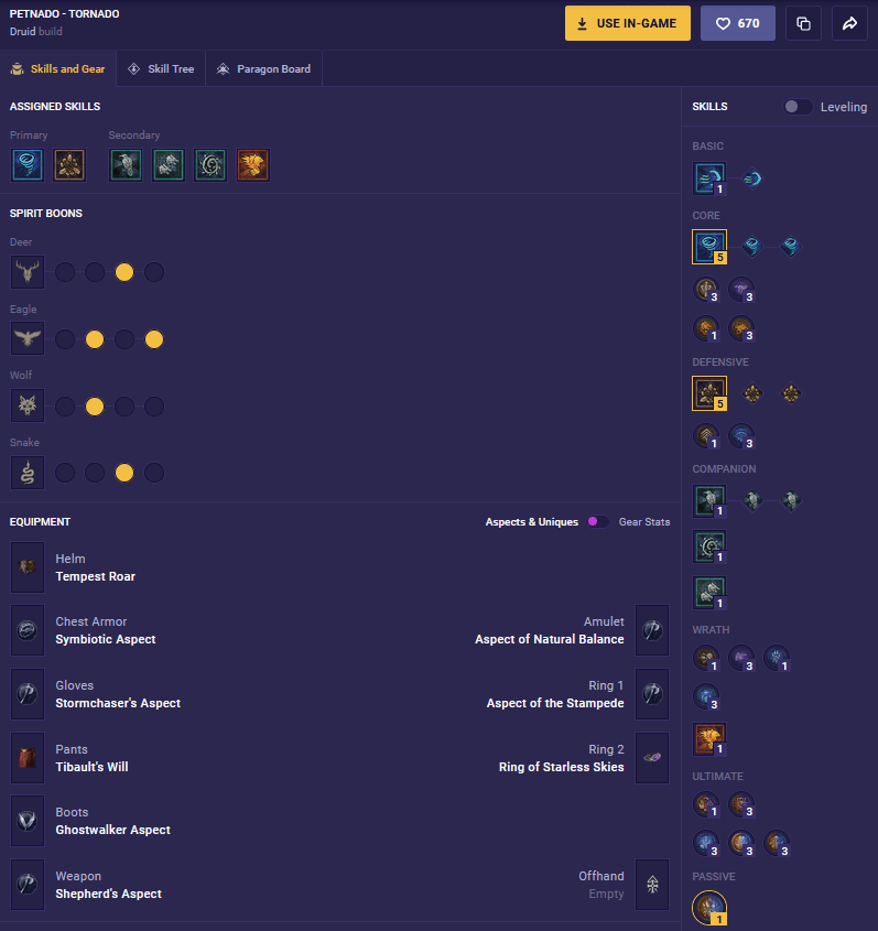 The build is focused on using Tempest Roar to switch Storm skills into Werewolf skills and giving Storm skills up to a %chance to grant spirit. It also utilizes the “dynamic duo” Shepard’s Aspect with Tibult’s Will, giving a consistent boon to damage and increasing resource generation when going unstoppable.