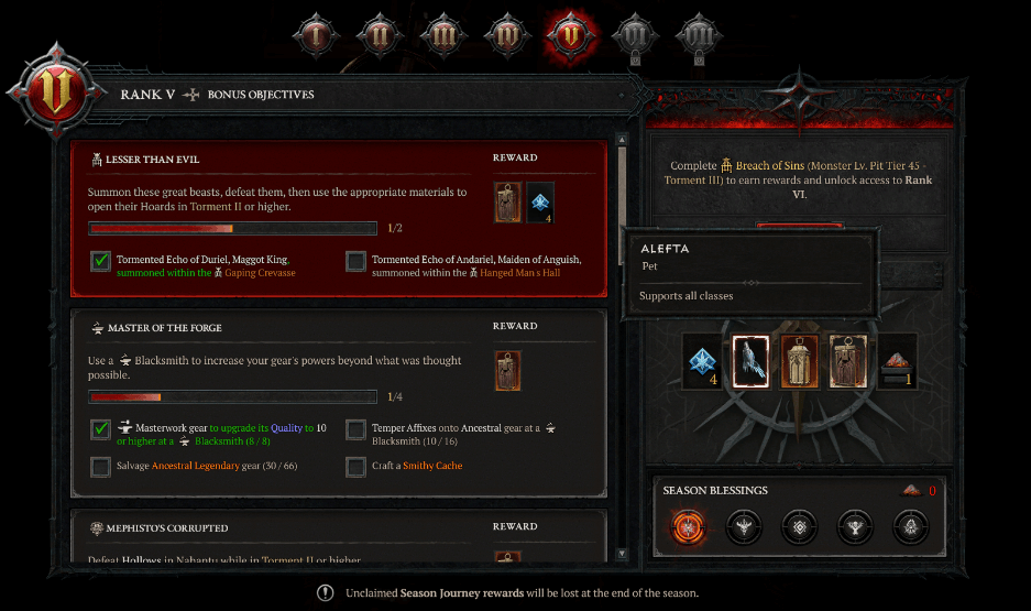 New Evil has invaded the seasonal realm of Sanctuary. Team up with Hadrielby visiting any major city to start the seasonal questline and fight these new forces of evil. Killing aLesser Evilfor the first time drops a corresponding Corrupted Essence. Returning this Essence to Hadriel will unlock the two Divine Gifts associated with that Lesser Evil.