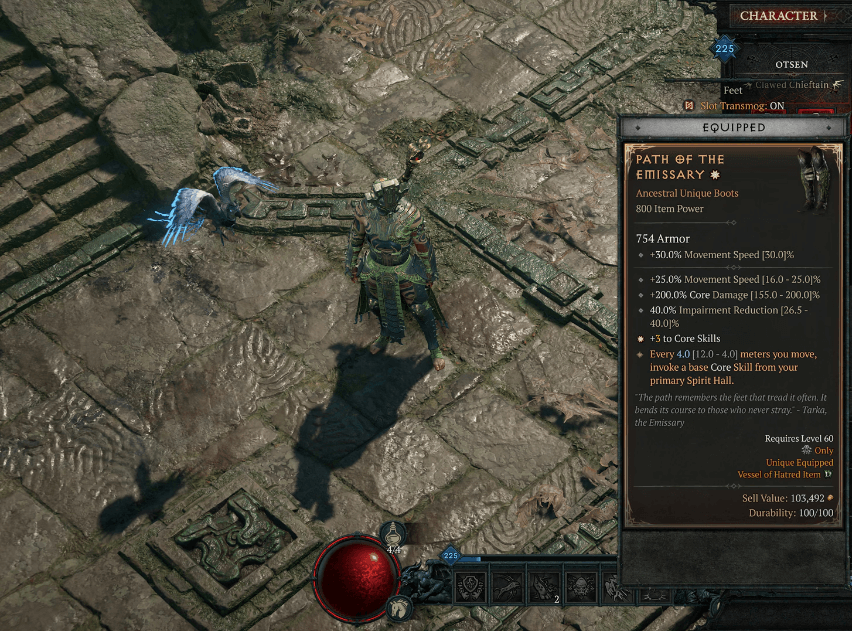 Damaging 150-100 Enemies with Nature Magic Skills grants Max Movement Speed and Unhindered for 4-8 seconds. Enemies you run through are Immobilized for 1 second.
