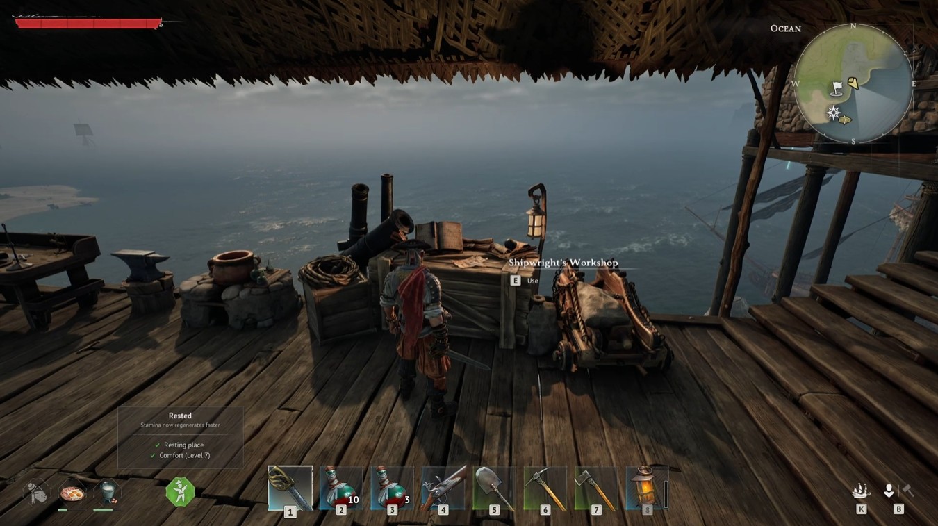 Continue his quest line until you unlock the Shipwright's Workshop. From here you'll be able to prepare for the open seas by not only building a sea-worthy vessel but crafting add-ons such as cannons, armor, and boarding equipment.