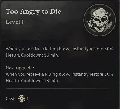 The last talent for this build is Too Angry to Die. At a time where you would die, this would instead keep you alive.