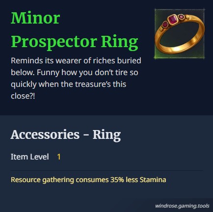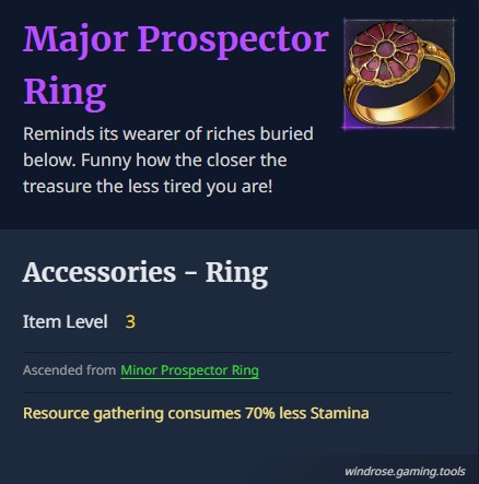 There are other items too including Marksman’s Rig, which provides -30% stamina consumed by sprinting and dashing and the Prospector's Ring, which reduces resource gathering consumption by 35%/70% less Stamina. A good idea would be to read all the accessories, items, and gear you find and try to weigh up the pros and cons of each. Ask yourself what you want more, and take it from there.