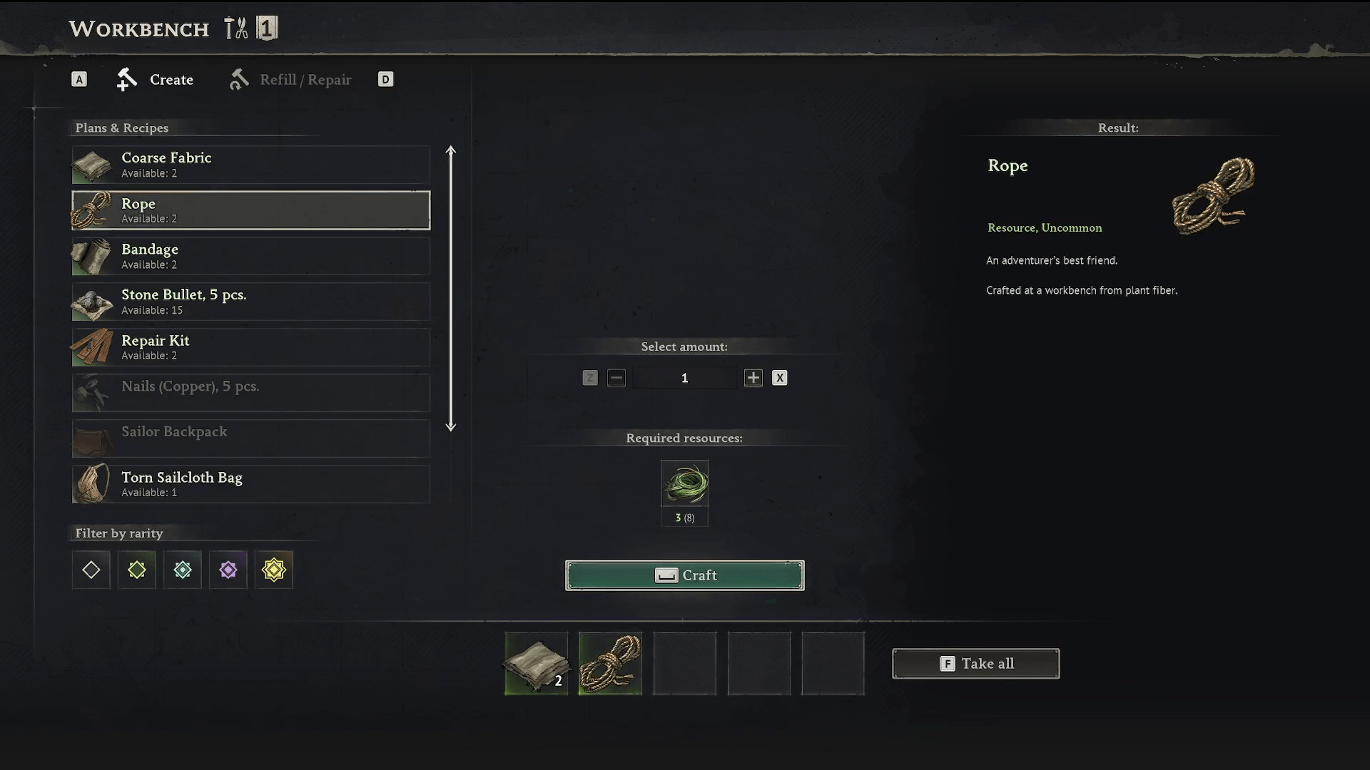 Here's all the recipes available and what you need to craft them. If you don't see some of these recipes in your game, you will need to explore further to unlock them.
