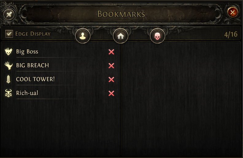 You can have up to 16 Atlas Bookmarks, and they will be displayed at the edge of your Atlas as you scroll around. Clicking one of these icons will instantly travel you to that area of your Atlas. You can also hover over the icon to see the name you had assigned to that Atlas Bookmark