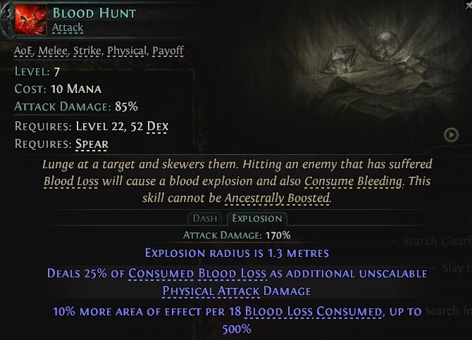 Blood Hunt Skill is a Spear Attack Skill that consumes Blood Loss and Bleeding to cause a blood explosion that deals Physical Attack Damage based on the amount of Blood Loss that was consumed.