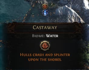 Castaway is a Water biome map and as that might suggest you'll find it primarily near Lakes on the Atlas. It's also one of the more common Unique maps and you'll come across many as you explore. The only known exception to Castaway's biome is when it spawns proximally close to a Citadel which can overwrite it with something Citadel specific, for example Vaal City near a Stone Citadel.