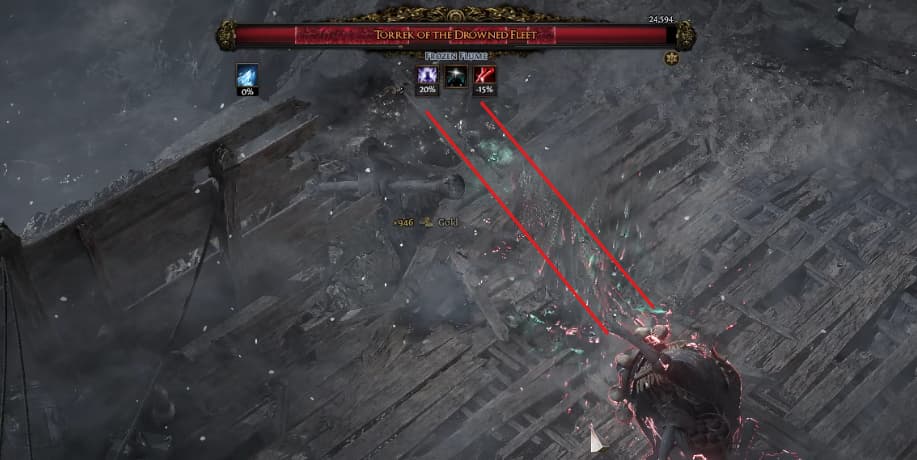 One of Torrek's primary ranged attacks will be Waves that he thrusts towards you after pirouetting with his anchor. These are slow moving and don't hit particularly hard.
