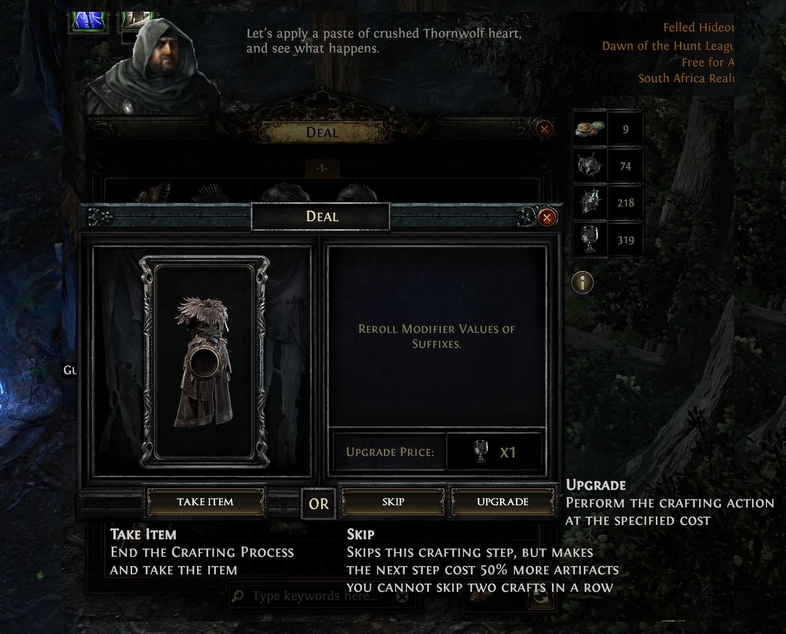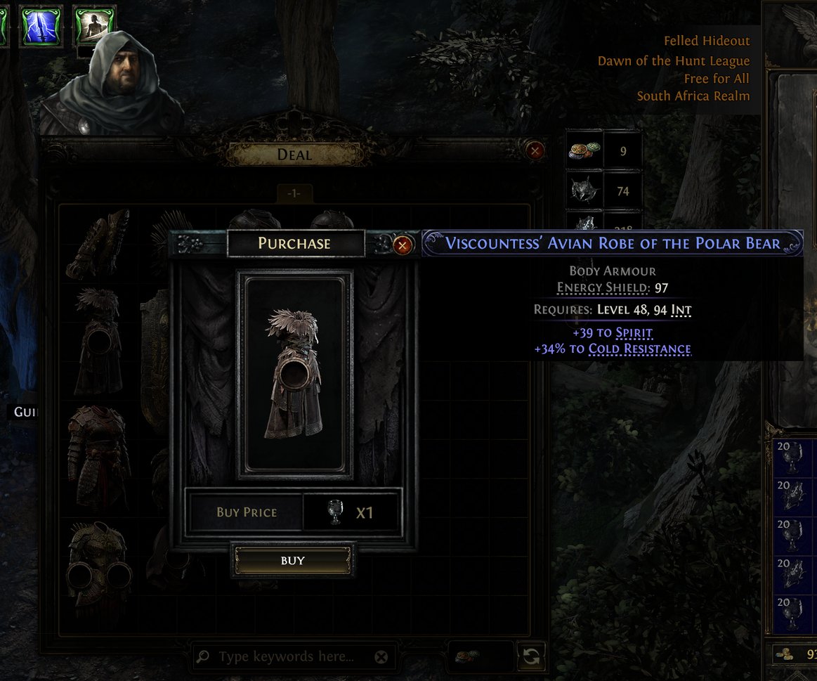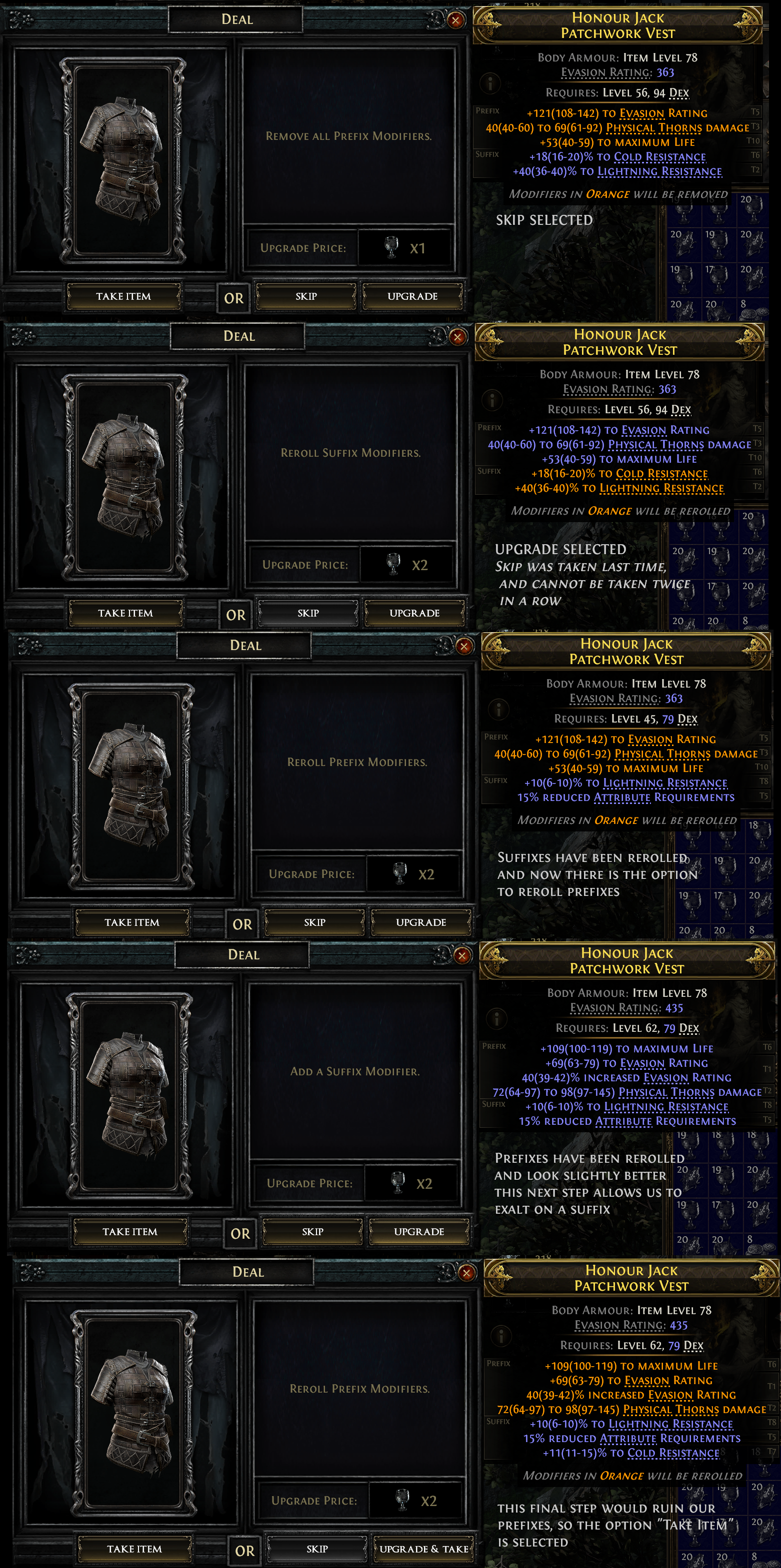 That being said, this process can occasionally produce very powerful results, and can be a great way to fish for upgrades in SSF. Sometimes, even ignoring all crafting options, an item might appear in the window that is a direct upgrade for a player, and the Take Item option can be selected to buy it outright without performing any of the crafting steps (although it's always advised to at least check what the Vendor offers in case they can further improve the item).