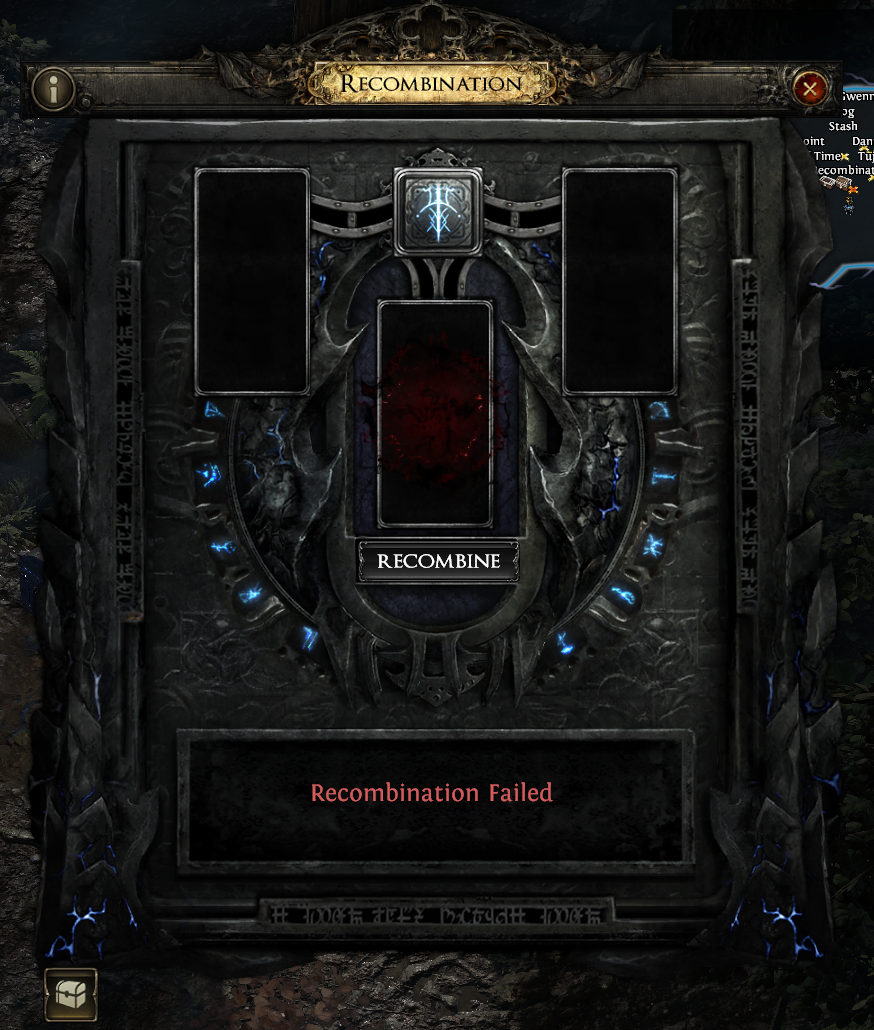Once the player is happy with their selection, they can press Recombine for a chance to have a resulting item with the selected modifiers
