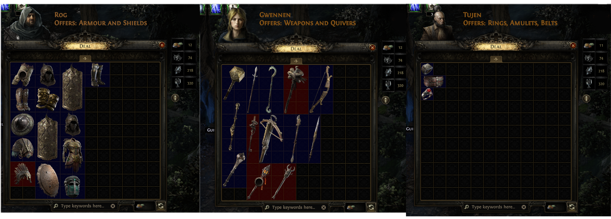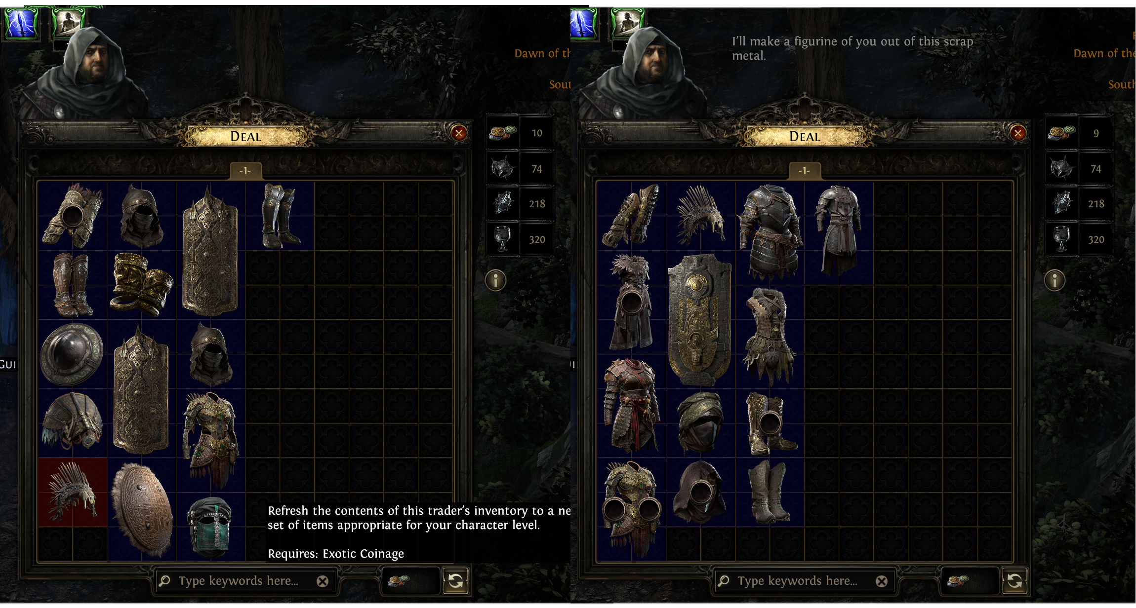Expedition Vendor windows can also be rerolled, to show a new set of items by using Exotic Coinage. If you don't see anything else you want to craft on, or are fishing for a specific base, you can click the Refresh button at the bottom right of the Vendor window. This will cost 1 Exotic Coinage and fill the window with new bases