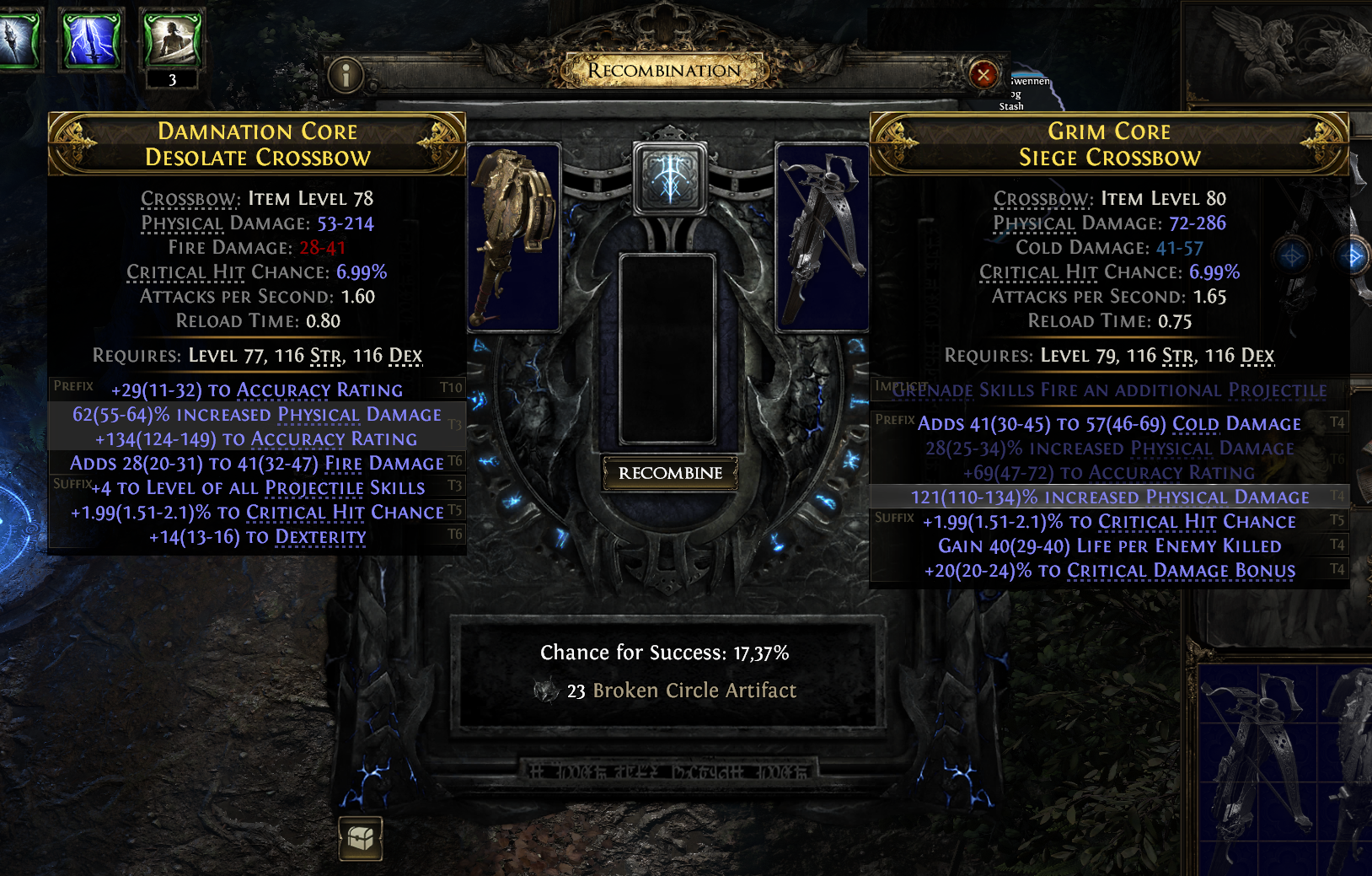 Players must place two items of the tame type in each of the top slots and can then select modifiers which they would like to attempt to Recombine. The Chance for Success is shown at the bottom, along with the Artifact cost.