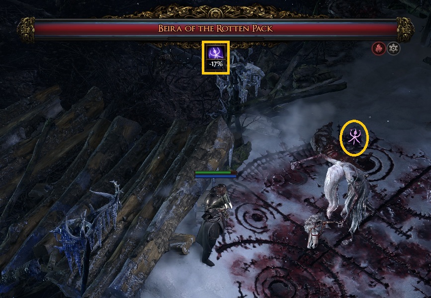 Curse Debuffs on Monsters are indicated with a status icon below their Life bar, and a symbol that hovers above the Monster itself. If applicable, the status icon will also include a numerical value to indicate the magnitude of the active Debuff.