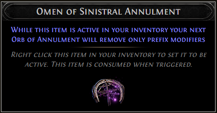 In this case, the Omen 'bans' your Annul from deleting the suffixes, and the fracture 'bans' it from deleting the prefix you do not want deleted. Four out of five mods are banned, so the Annul always hits the fifth.
