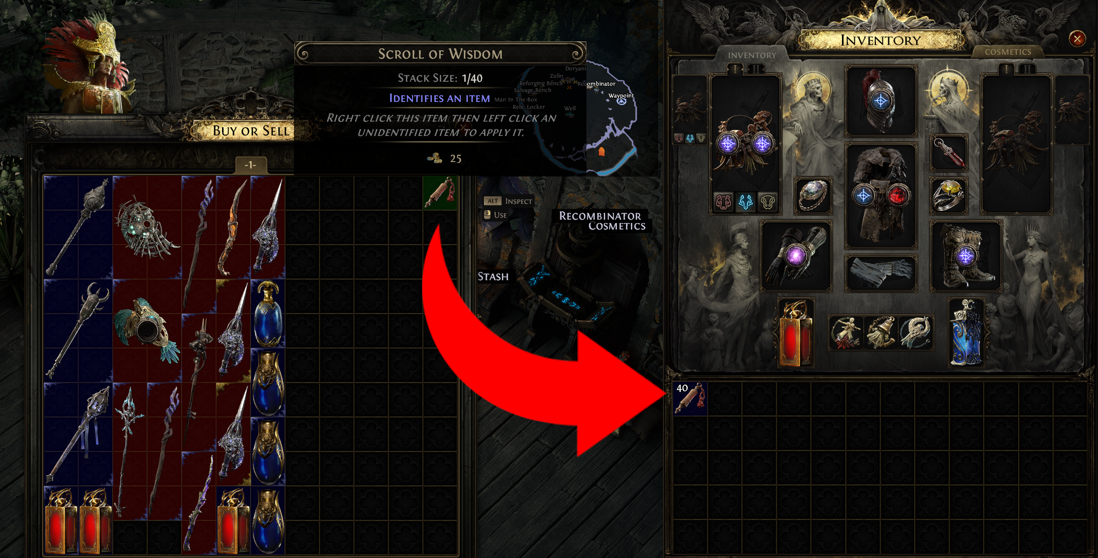 If you have more than one stack of the same type in your inventory or Stash, you can Ctrl-right click to take or return all stacks of that type. For example, after completing a Map, if you have 400 Orbs of Transmutation, you can place them all into your Stash by Ctrl-right clicking them