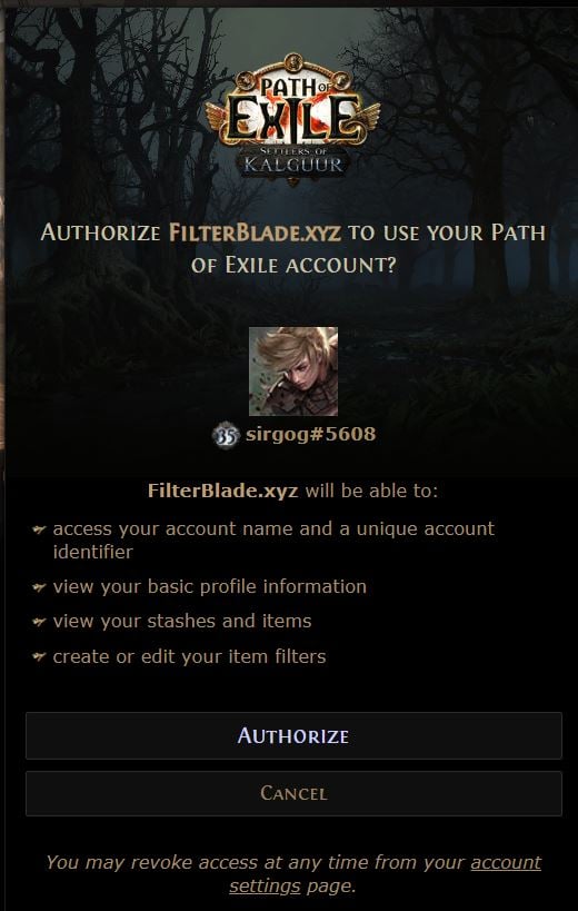 When you click 'Sign In With POE' in the top-right, you can allow Filterblade very limited access to view your Path of Exile account. Double, triple, quadruple check that this page is from www.pathofexile.com or www.pathofexile2.com then click 'Authorize'