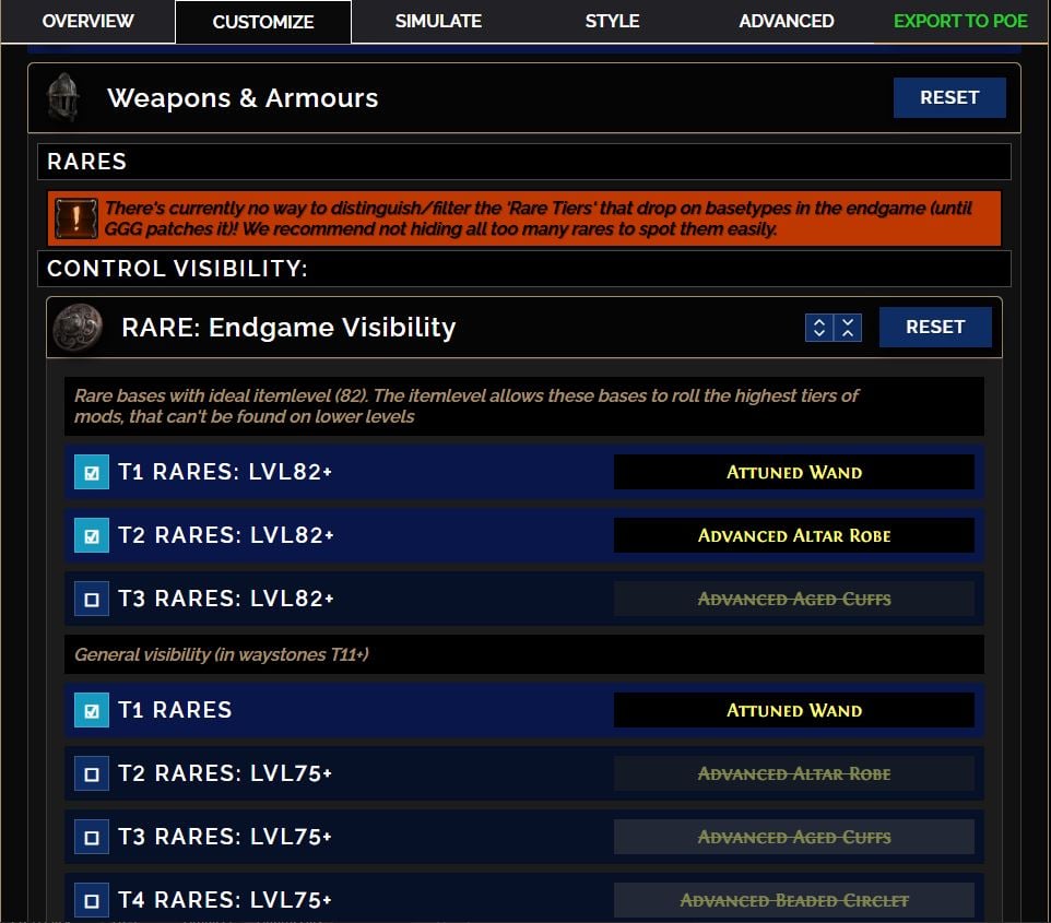 You can configure this further to decide just HOW an item level 82+ version of your designated Tier 1 and Tier 2 bases appears, as well as how a lower item level version will appear, in the other settings.