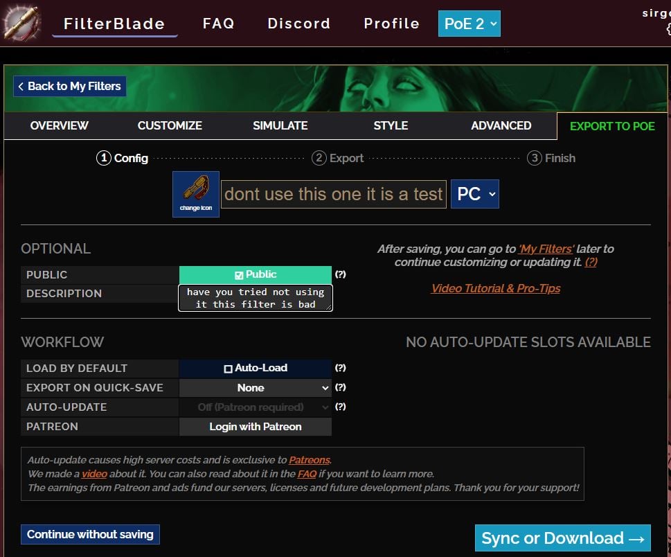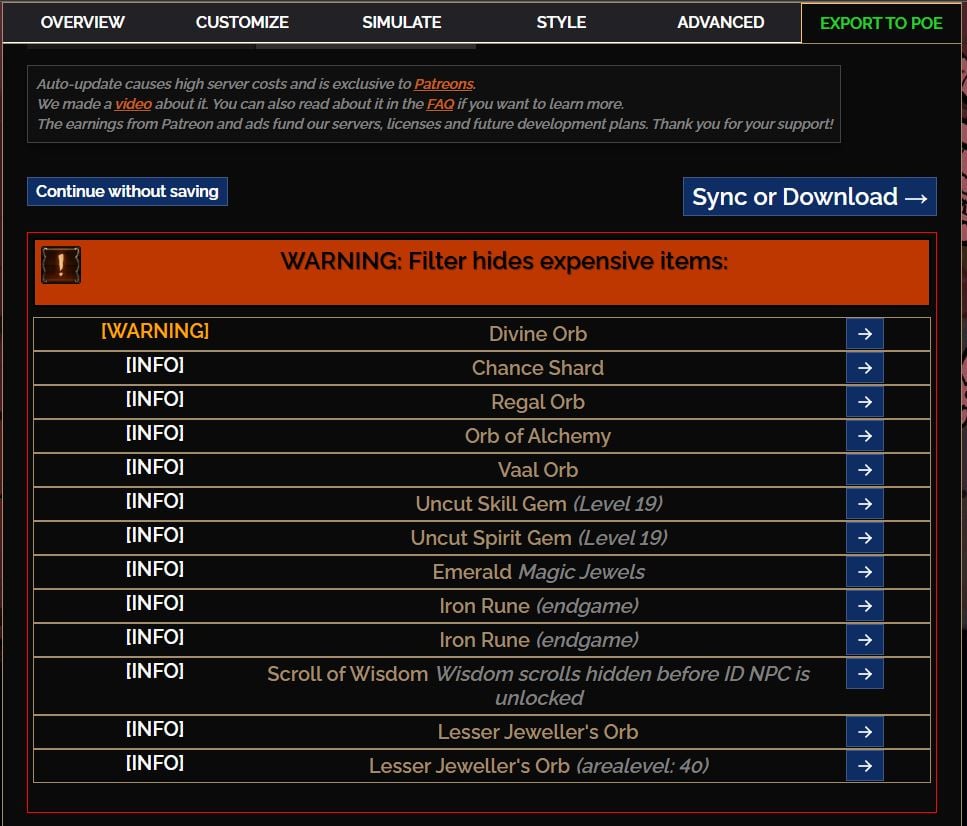 Importantly, Neversink has built in a number of safety tools to catch huge mistakes. Have a look what happens in the final steps if I tell my loot filter to hide Divine Orbs.
