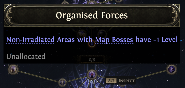 Organised Forces Passive - "Non-Irradiated Areas with Map Bosses have +1 Level"