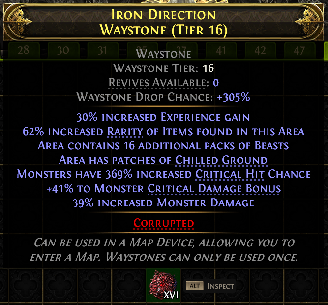 Using a Vaal Orb on a Waystone has a chance to increase its Tier by 1, up to maximum of Tier 16 with a base Area Level of 80