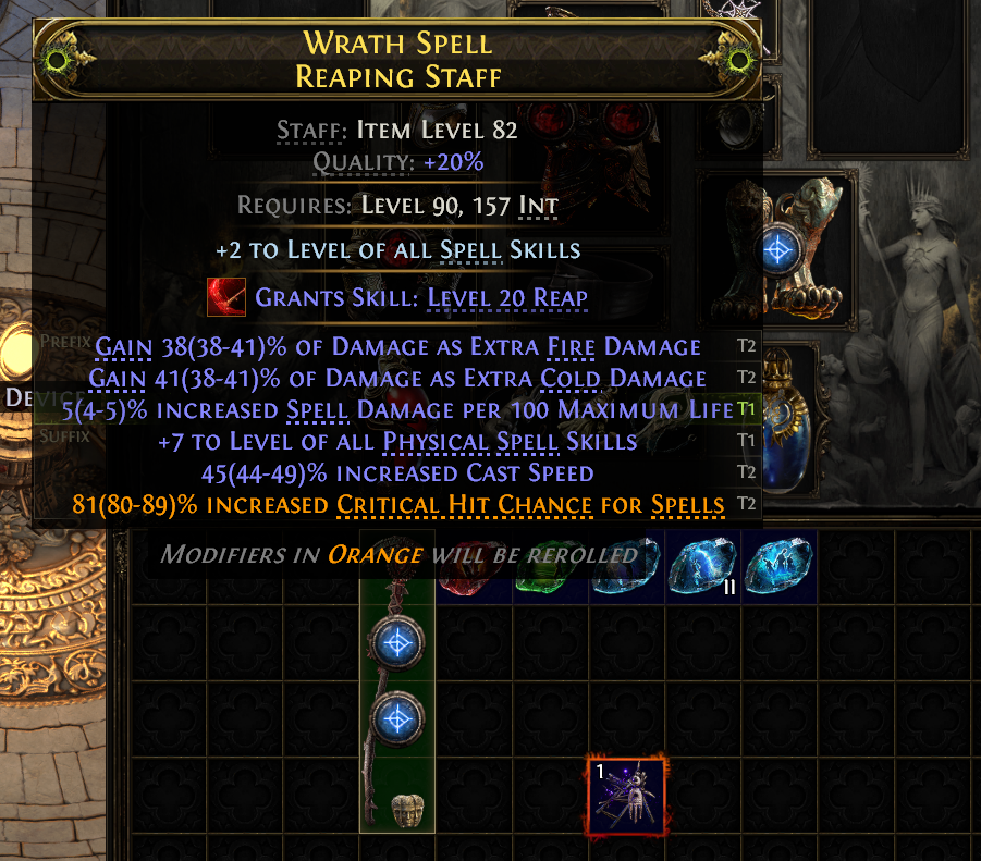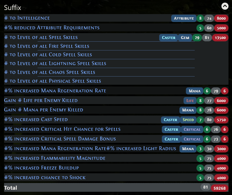 A player who understands the mod pool might notice that there are no other Suffix modifiers with the Speed or Gem Tags, and that the only two other Suffixes with the Caster Tags are two modifiers that the players want - #% increased Critical Hit Chance for Spells and #% increased Critical Spell Damage Bonus.