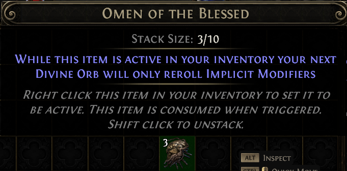 Omen of the Blessed will cause your next Divine Orb to only reroll the Implicit Modifiers of an item and its existence borders on being offensive