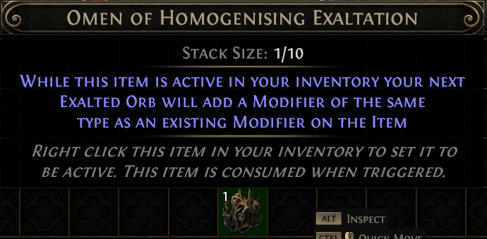 The Omen of Homogenising Exaltation is one of the most powerful Omens, but requires a strong foundational understanding of modifier Tags and the mod pool to use properly. The way that this Omen functions is that when combined with an Exalted Orb, the only modifiers that can be added to the item are modifiers that share Tags with existing modifiers on the item.