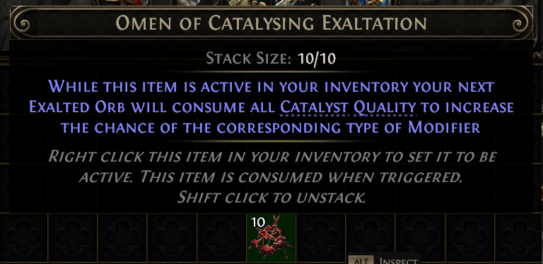 The Omen of Catalysing Exaltation is a slight mystery in that its exact function isn't entirely known. This Omen will cause the next Exalted Orb to consume all Catalyst Quality on a Ring or Amulet to increase the chance of adding a modifier with a similar Tag.