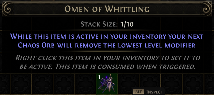 The Omen of Whittling is a less-commonly used Omen, but has a powerful function in that it can be used to accurately reroll an undesirable, lower level modifier on an item with a Chaos Orb.