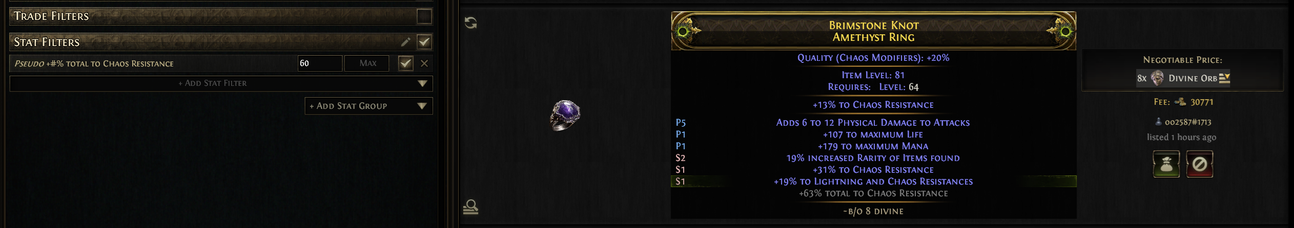 The above search was for a Ring with a total of 60% Chaos Resistance. There is no individual modifier with 60% Chaos Resistance, but some items can have hybrid mods that will mean an item's total Chaos Resistance adds up to this much