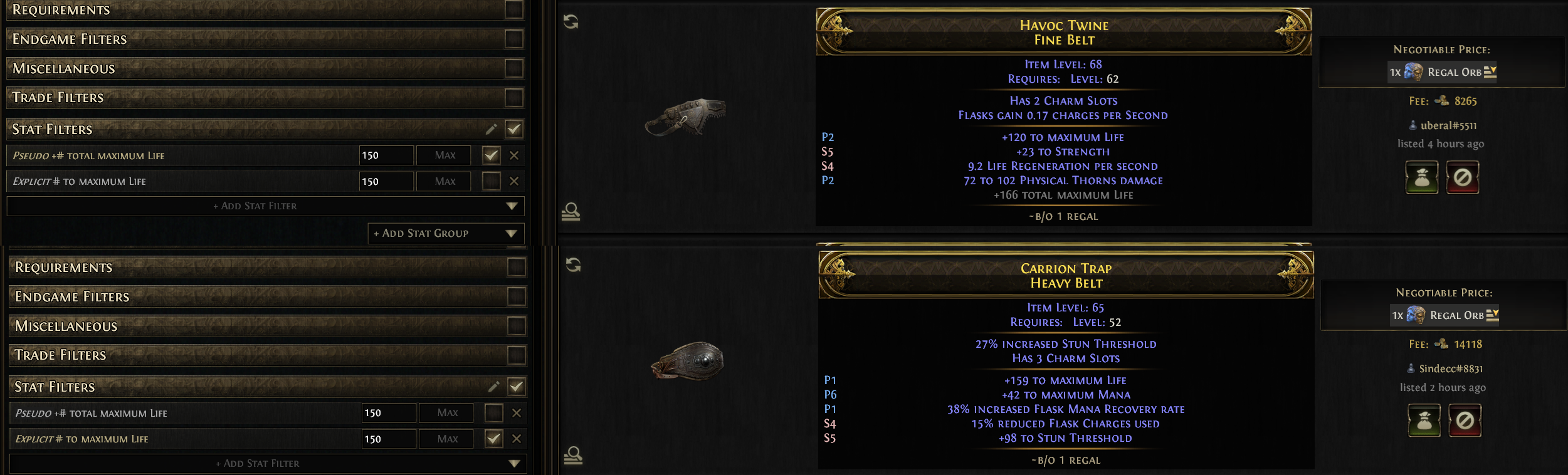 Buyout Price: allows you to show results for items that have been listed for a specific Currency type as well as a minimum and maximum value. For example, you may search for a Headhunter Leather Belt and try your luck to see if anyone has listed one for 10 Divine Orbs. It's unlikely, but this can be useful for only showing results that you can afford to buy