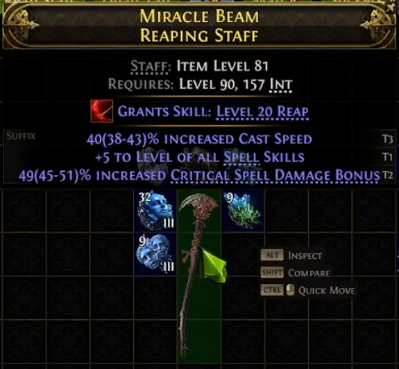 In the first step of this craft we are aiming to get our Reaping Staff as a Rare item with any Prefix and a Cast Speed Suffix.