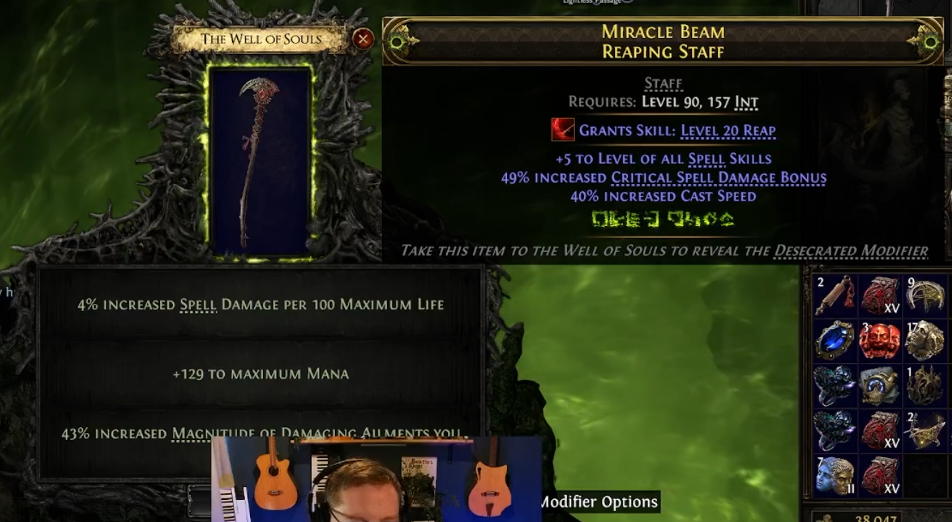 Optional: you can use an Omen of Abyssal Echoes to be granted an option to reroll the Modifiers the Well of Souls offers. You are guaranteed to Reveal the 4-5% Spell Damage per 100 Maximum Life, but this means that if you get a 4% roll on the first attempt, you can reroll it to try to get a 5% roll instead